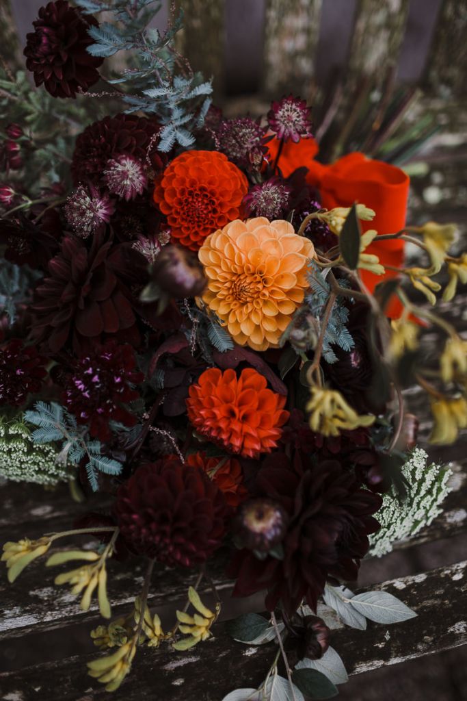 Sumptuous and dramatic tones using chocolate cosmos, black and scarlet dahlias, golden kangaroo paw, lots of textured silvery toned leaves, such as mimosa and cotoneaster and tied with a scarlet velvet ribbon. The white lacy in appearance cow parsley worked beautifully with Ivana’s intricately crocheted handmade white wedding dress.