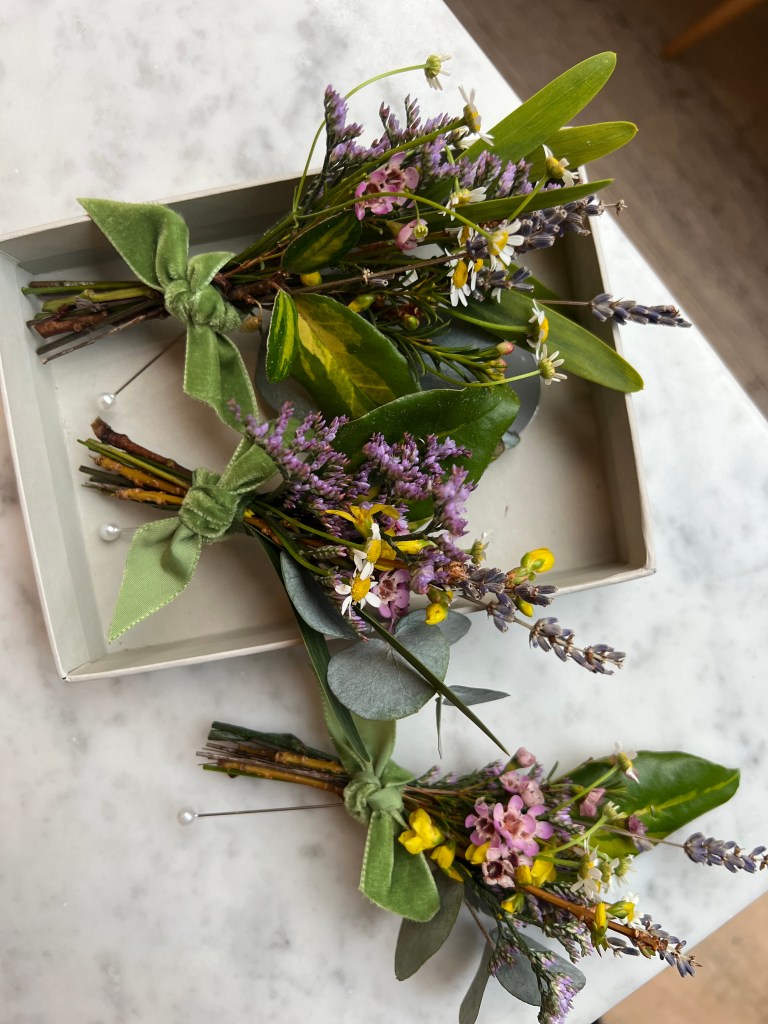 Chamomile, lavender, eucalyptus, wax flower, forsythia and moss green velvet ribbon – take a deep breath whilst these aromatic little bundles are sitting quietly beneath your nose. Who needs rescue remedy when you’ve got a button hole to calm the nerves xxx